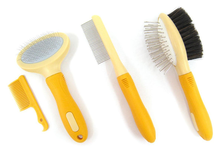 The set includes a mini slicker brush, a fur comb, double brush and a cleaning comb. The mini slicker brush is suitable for brushing frizzy fur. The fur comb is for combing through the fur after brushing. The double brush has bristles on one side for fine brushing and metal pins on the other side to loosen knots. The cleaning comb is used to clean the comb and the brushes.
