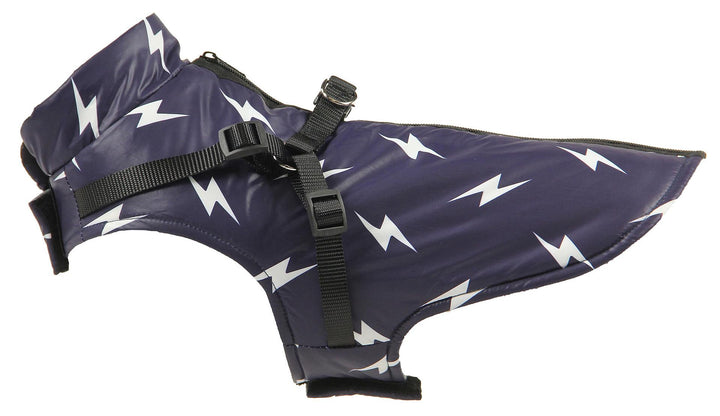 Dog coat Blizzard , outside nylon dark blue with white flashes, zipper as a decoration, inside gray jersey, with Velcro. Washable at 30°C.