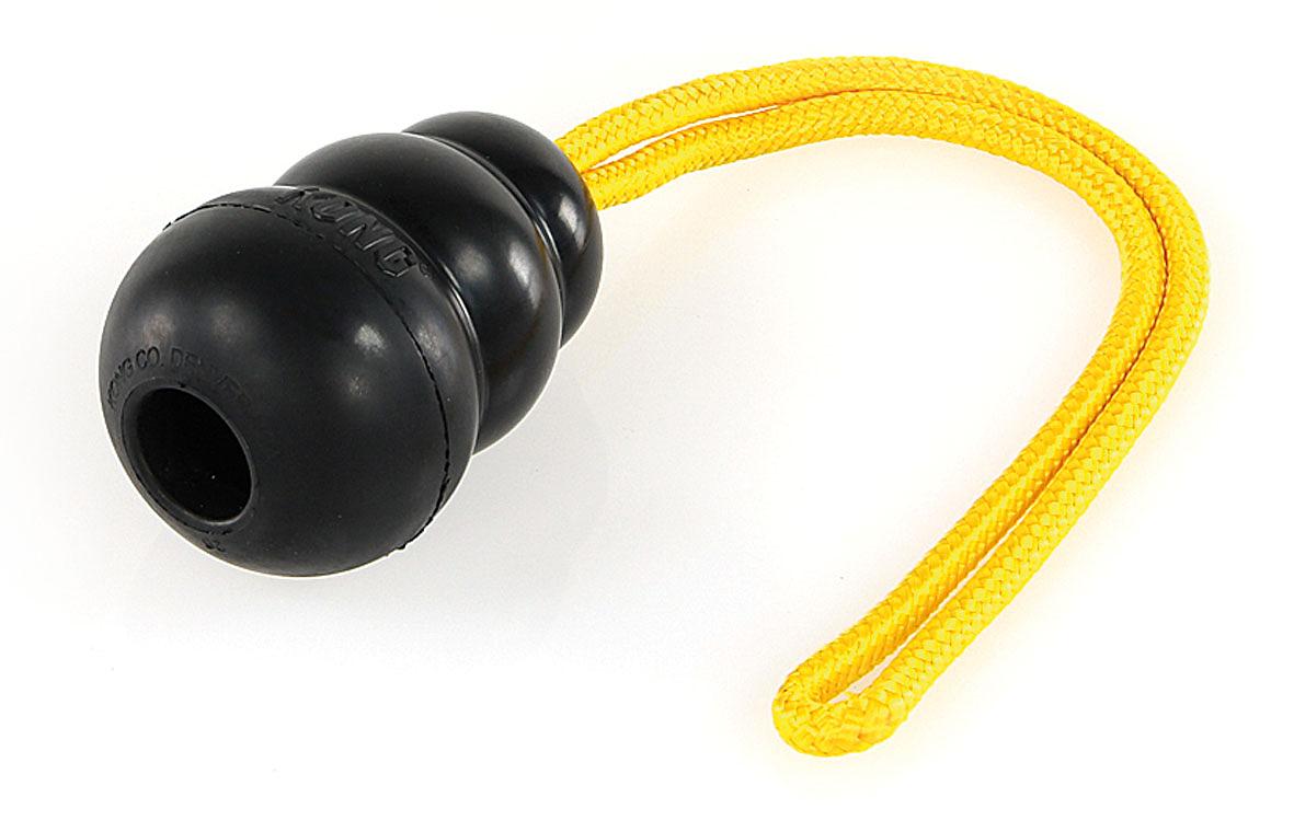 KONG Extreme with rope: The KONG Extreme is the most robust variant of our KONG Original toy made of natural rubber . The ultra-strong, extremely hard-wearing, black natural rubber is specially designed for dogs that are strong chewers . Ideal for filling with treats. Helps reduce boredom and separation anxiety in strong chewers. Jumps and hops completely unpredictably, ideal for fetch games. Especially good for police, drug and military dogs. Also used by Schutzhund and AKC dog trainers. Made in the USA.