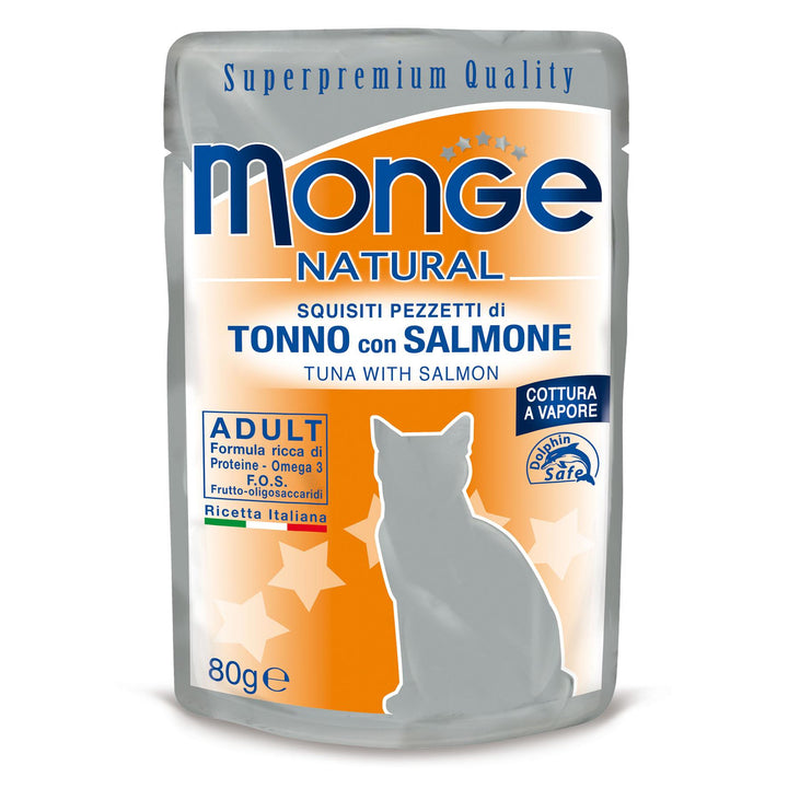 Monge Natural Cat Tuna with Anchovies is a supplementary food for adult cats with delicious steamed tuna bites with anchovies. This cat food has all the important properties of a high-quality product: high palatability made from fresh and high-quality ingredients and with a high nutritional value. Rich in omega 3 and protein, and low in fat.