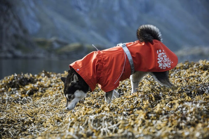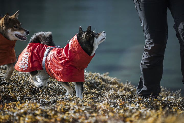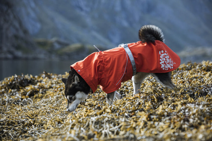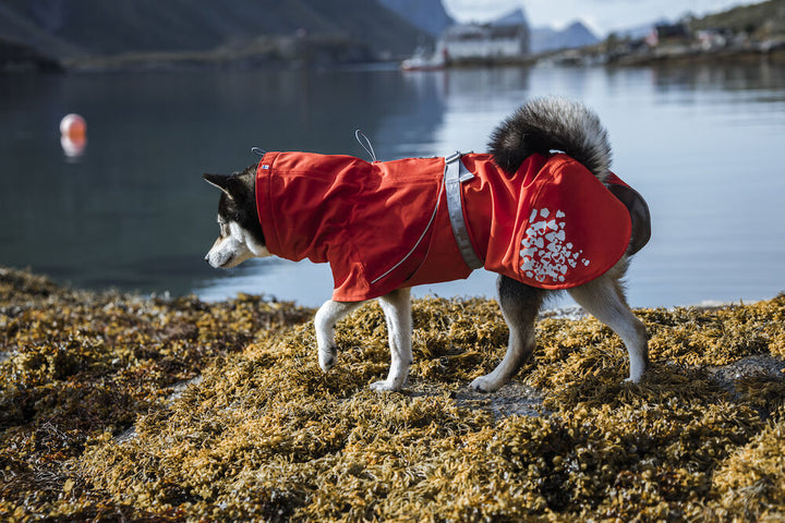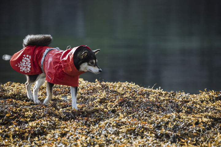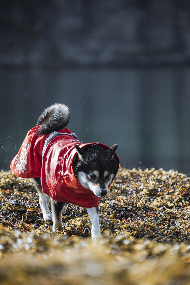 The large, attractive reflective prints on the back hem of the coat and the 3M reflective piping on the back increase safety and visibility in the dark. The excellent sizing of the Monsoon coat guarantees a good fit for most breeds. The wide belly flap keeps the coat in place and ensures it stays on without restricting the dog's freedom of movement, even when the dog is playing. The flap bed corners the dog's abdomen and effectively protects it from mud and sand. Monsoon is made from a stretchy and silent fabric, making it comfortable to wear and quick to put on.
