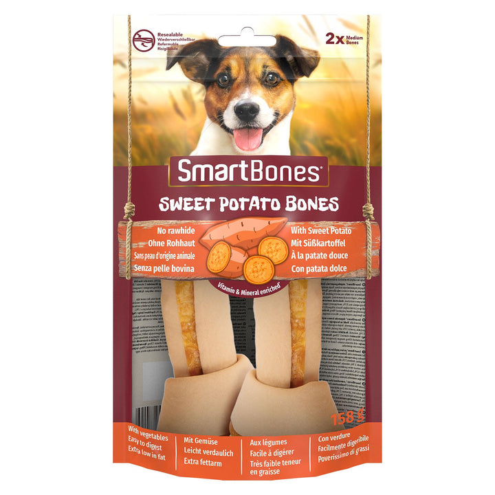 SmartBones® are healthy chewing snacks that are easy on the gums. The inner layer consists of delicious chicken breast. For the outer layer, we use tasty veggies like sweet potatoes, peas and carrots - the result is an irresistible flavor that dogs love! SmartBones® do not contain cowhide. It is a healthy alternative to traditional rawhide chews, enriched with minerals and vitamins. The natural, cleaning effect of chewing SmartBones® keeps teeth and gums healthy. Since their texture is softer than cowhide, they are gentle on the gums and still guarantee fantastic chewing pleasure! From your dog's favorite flavor to uniquely shaped snacks, SmartBones® chews come in a variety of sizes, shapes and recipes to meet every dog's needs and preferences. Because SmartBones® chews are low in fat but high in healthy ingredients, they can be fed twice a day depending on your dog's calorie intake.