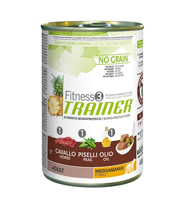 Trainer Fitness3 Adult with Horse, Peas & Oil is a grain-free, monoprotein-based complete wet food for adult dogs. Trainer Fitness3 Adult with Horse, Peas & Oil is wet food that contains horse meat as a source of protein plus special ingredients such as oil, peas, pineapple and goji berries. A complete food that gives your dog the energy it needs.